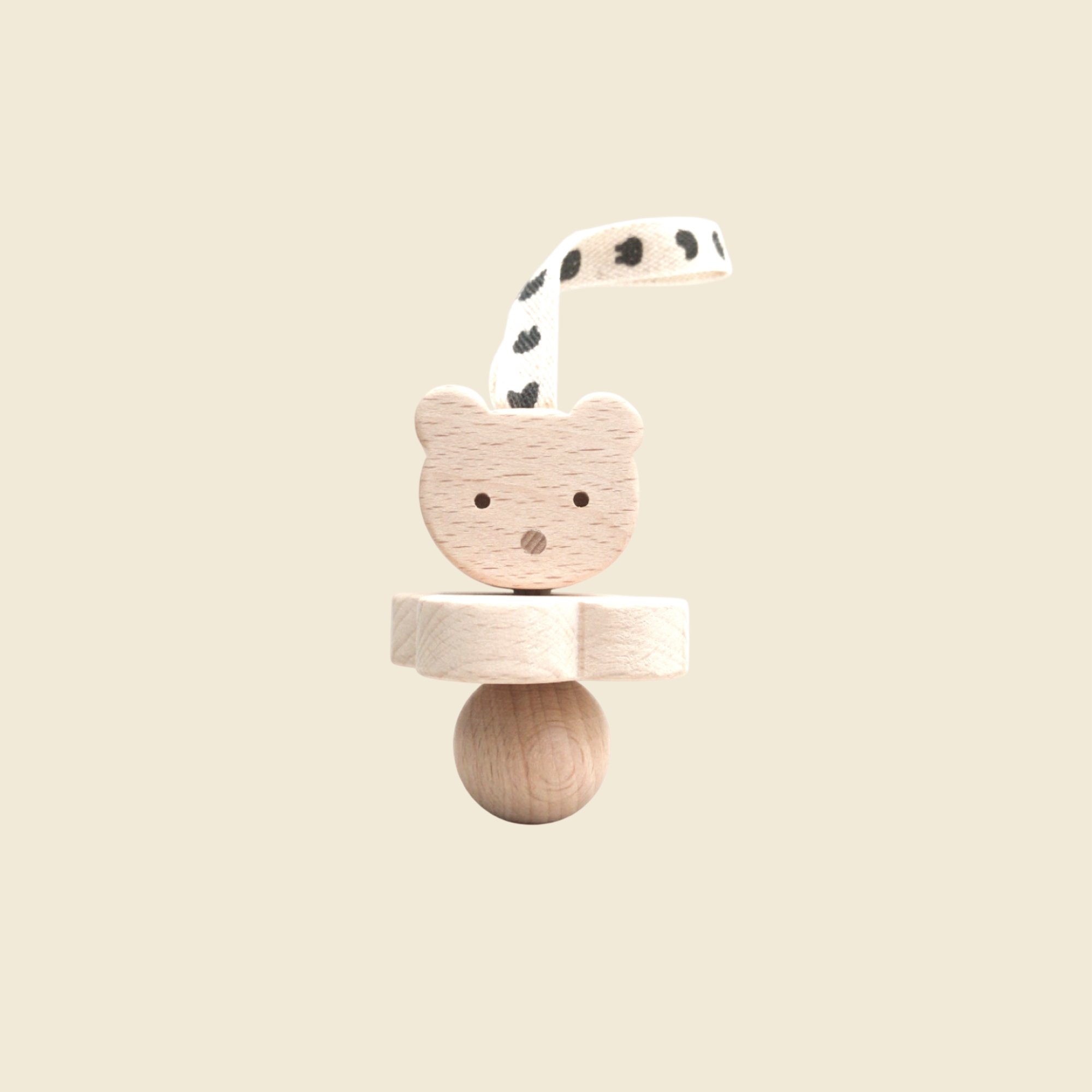 Un tout petit hochet avec un petit ours, pour les toutes petites mains composé de plusieurs modules à manipuler pour stimuler la motricité. Un jouet simple en bois brut, sans vernis ni produits, à offrir dès la naissance. Un objet qui va traverser le temps, que ce soit entre de petites mains ou en décoration. Pour jouer avec poésie et simplicité, et s’éveiller au monde doucement.